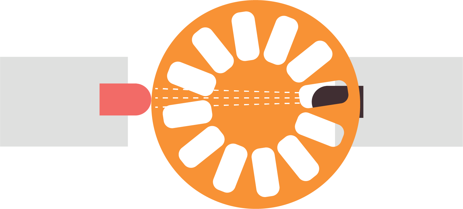 With the speed sensor, the infrared receiver and infrared LED are positioned directly opposite each other. The perforated disk, which is mounted on the motor shaft, is located between the receiver and the LED. If the motor shaft now rotates, the perforated disk also rotates. This repeatedly interrupts the infrared light of the LED. If you know the number of holes in the perforated disk (in this case 20), you know that the wheel has rotated 1/20 from interruption to interruption. Using this information, you can determine the distance traveled and if you add the time elapsed from interruption to interruption, you can determine the speed.