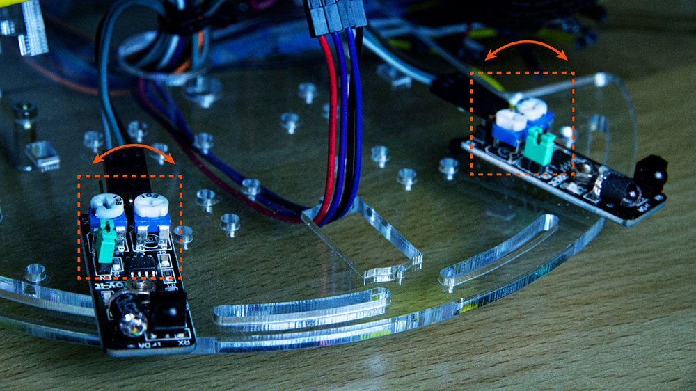 The sensitivity of the sensors can be adjusted if they no longer function reliably. The line tracking sensors and obstacle sensors are equipped with potentiometers that can be adjusted with a screwdriver to set the sensitivity. Each sensor is also fitted with an LED that only lights up when the sensor detects something. It helps you to check the function of your sensor and adjust it as well as possible.