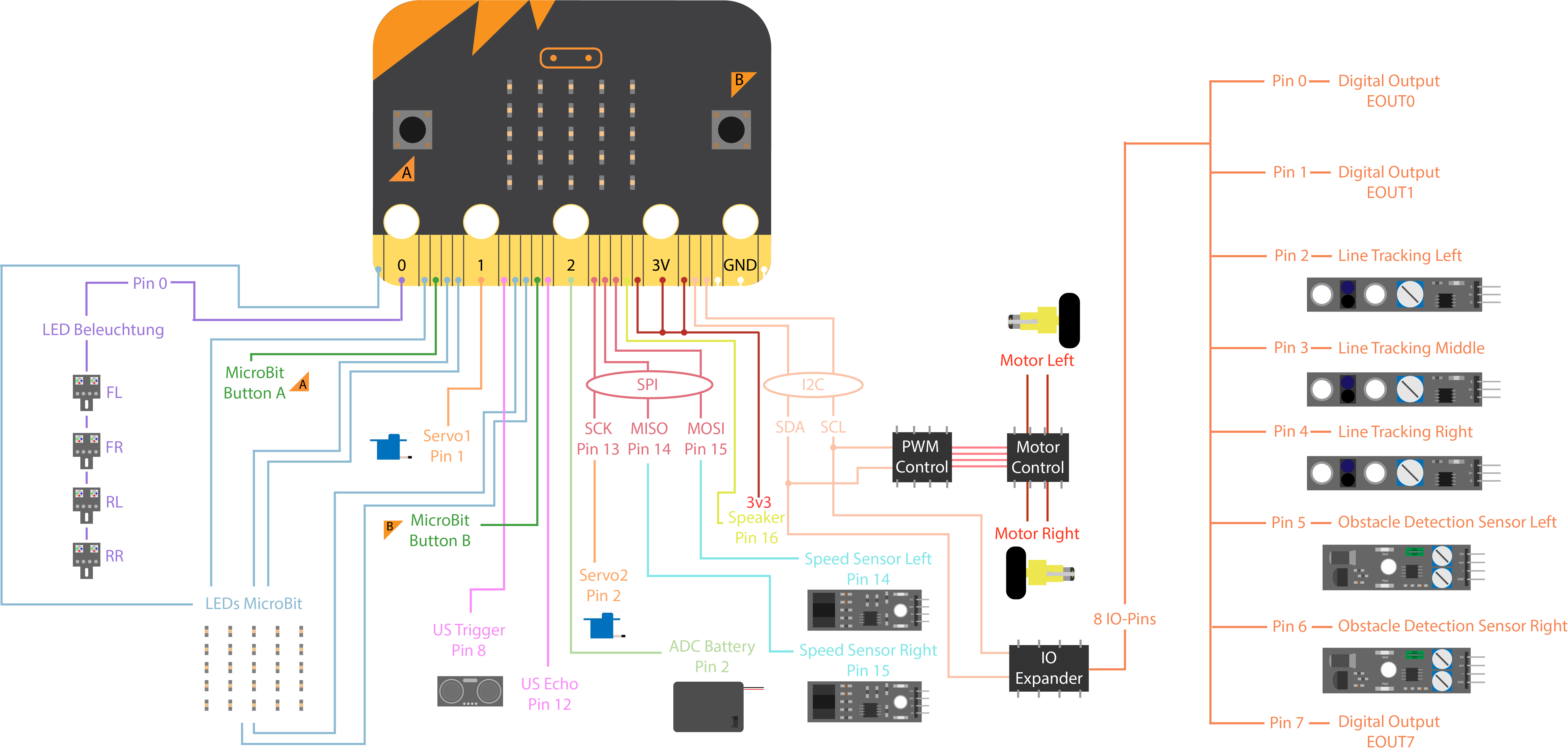 From this version onwards, the speed sensors are connected directly to the micro:bit. This change significantly improves the precision of the speed measurements. In addition, this change to the IO expander provides two further free digital outputs that can be used for additional functions.